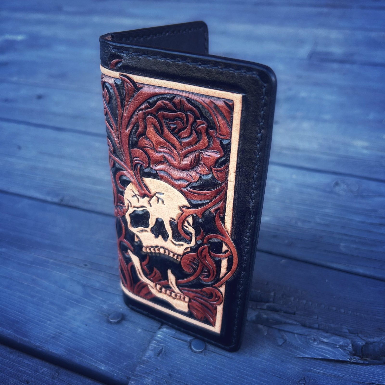 The Boulder Wallet is composed of full grain vegetable-tanned leather. All wallets are handmade, and each carving includes original art and dye work, making each one unique. Minor color differences can occur.