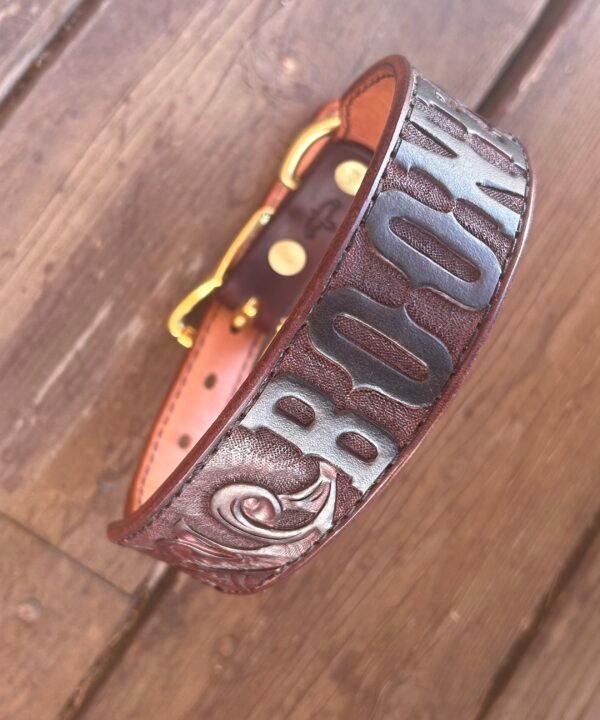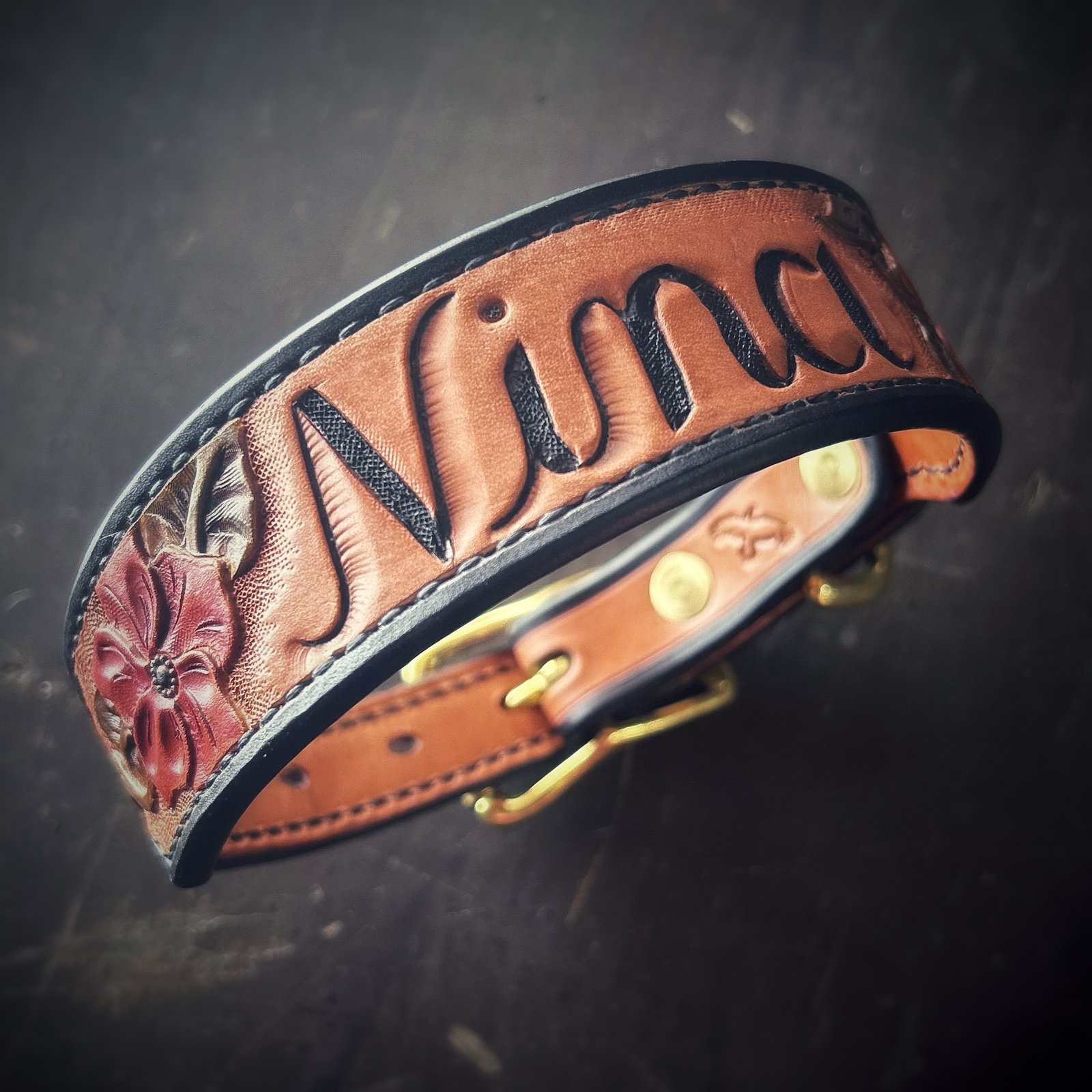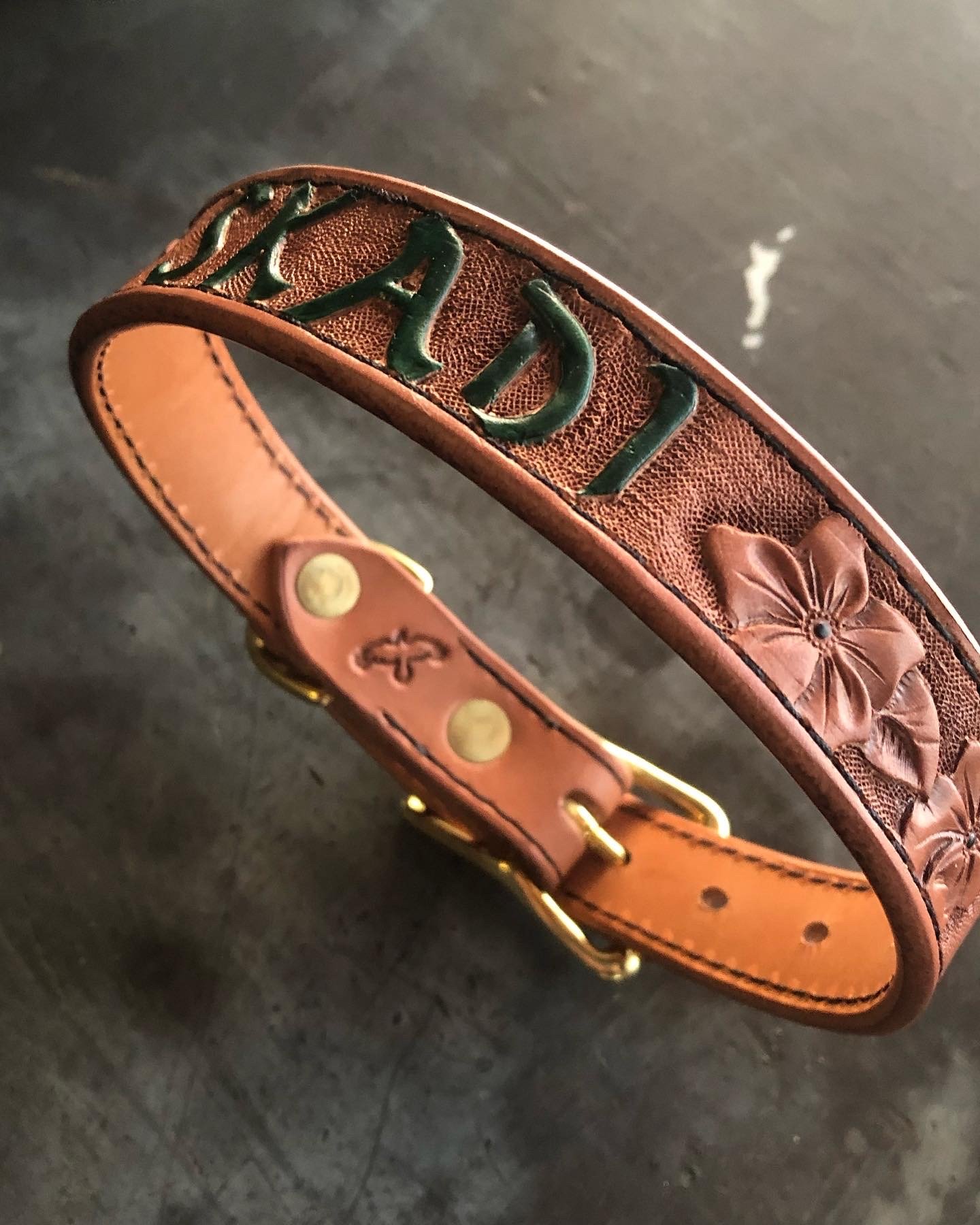 Dog Collar prices are based on the complexity of the request. Typically, a fully carved collar starts at $165 and a partially carved collar starts at $125. An estimate will be created based on your requests. While dogs don’t really care for rules, we do not recommend getting these collars wet. Regular care to apply a conditioner should be done every year at least.