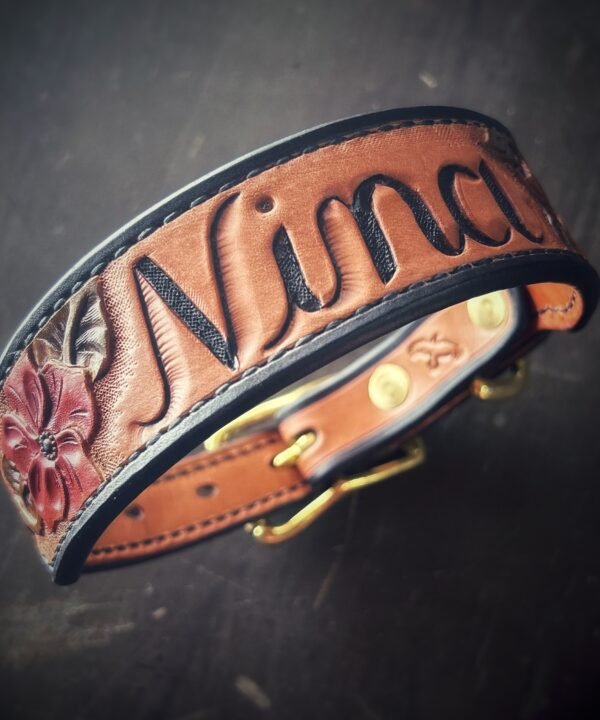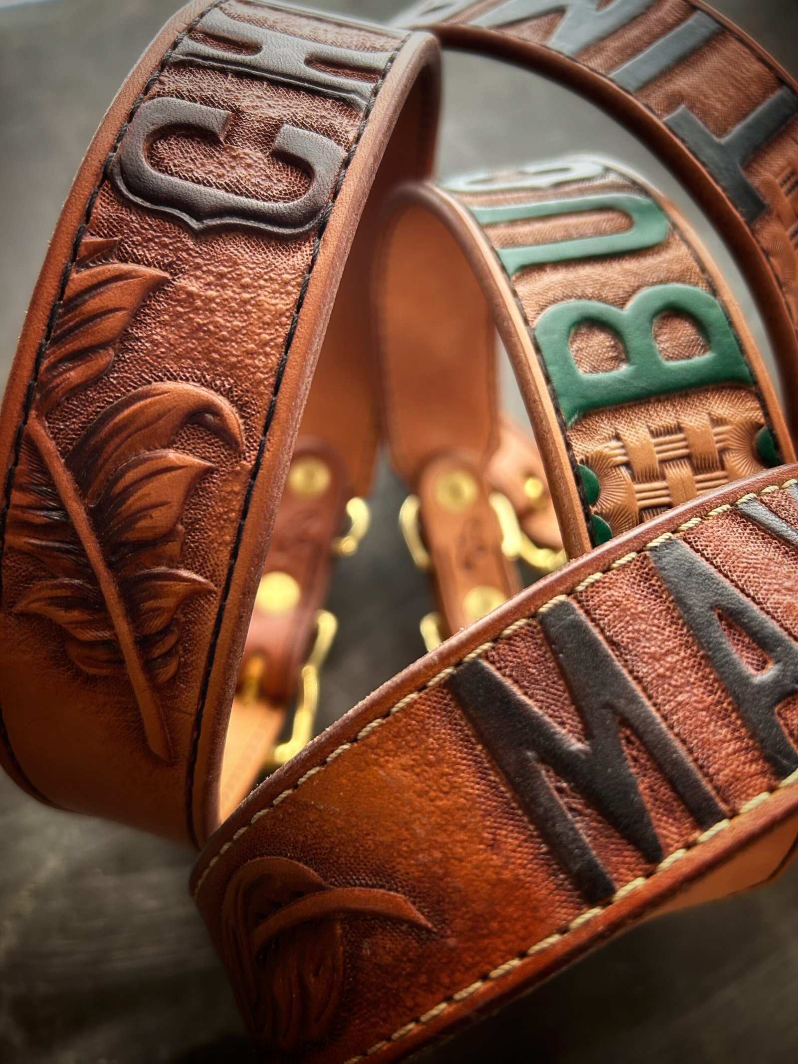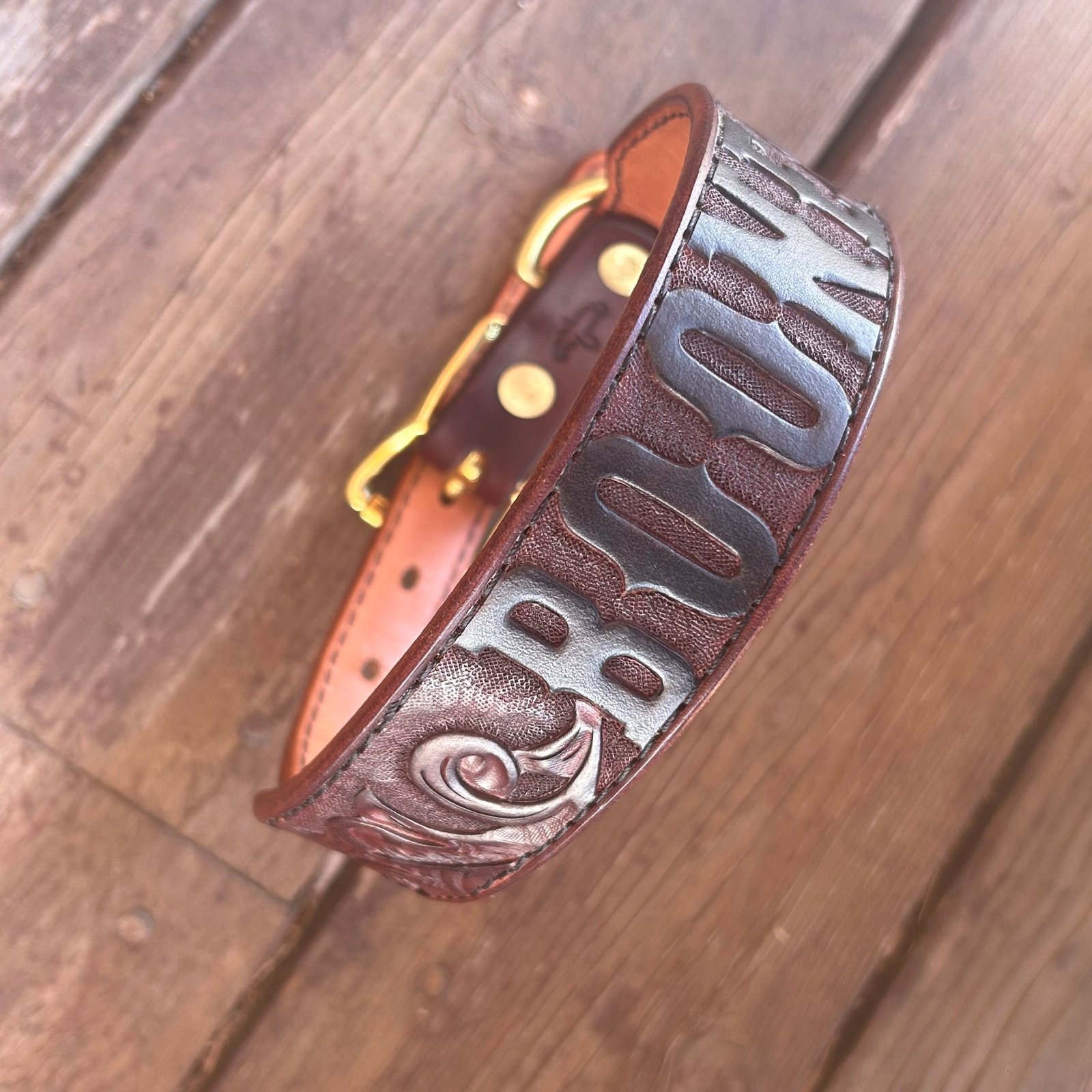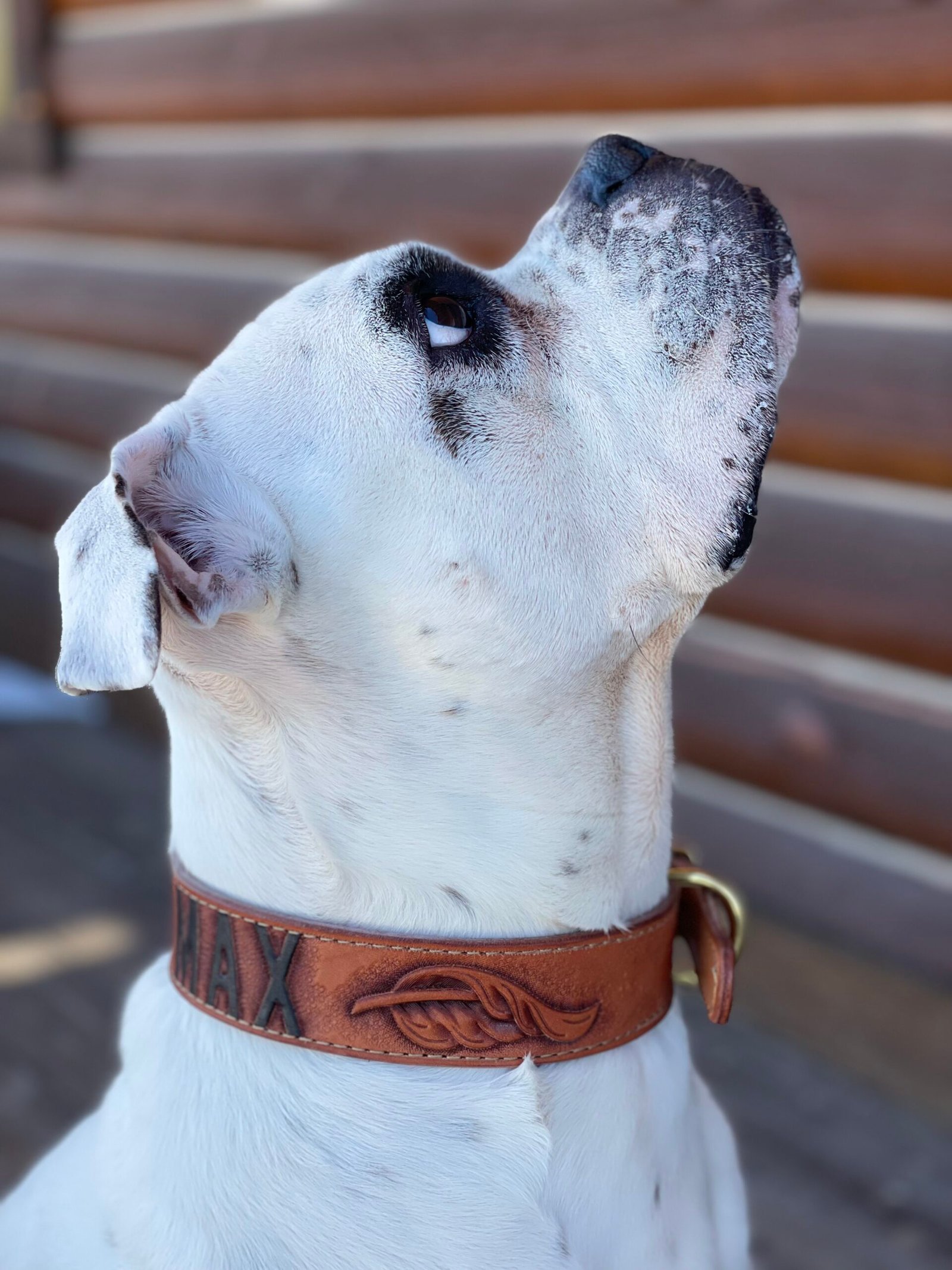 Dog Collar prices are based on the complexity of the request. Typically, a fully carved collar starts at $165 and a partially carved collar starts at $125. An estimate will be created based on your requests. While dogs don’t really care for rules, we do not recommend getting these collars wet. Regular care to apply a conditioner should be done every year at least.