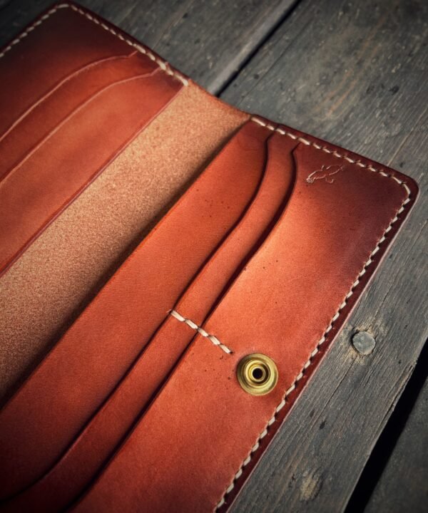 The Highland has eight card slots (which can hold several cards as they wear in) and two large pockets for cash and receipts. The interior pocket has been stamped with a small Windy Raven logo.