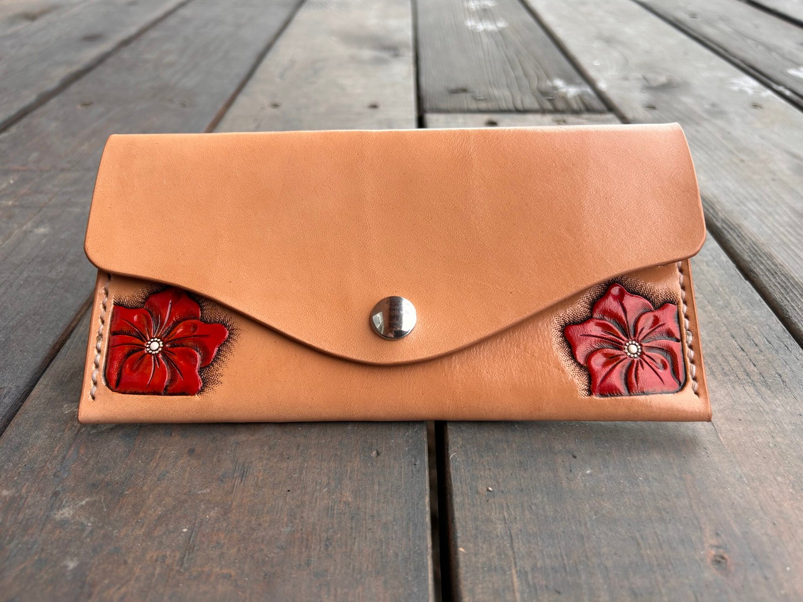 The Madison Wallet is composed of full grain vegetable-tanned leather. All wallets are handmade, and each carving includes original art and dye work, making each one unique. Minor color differences can occur.