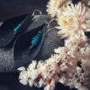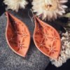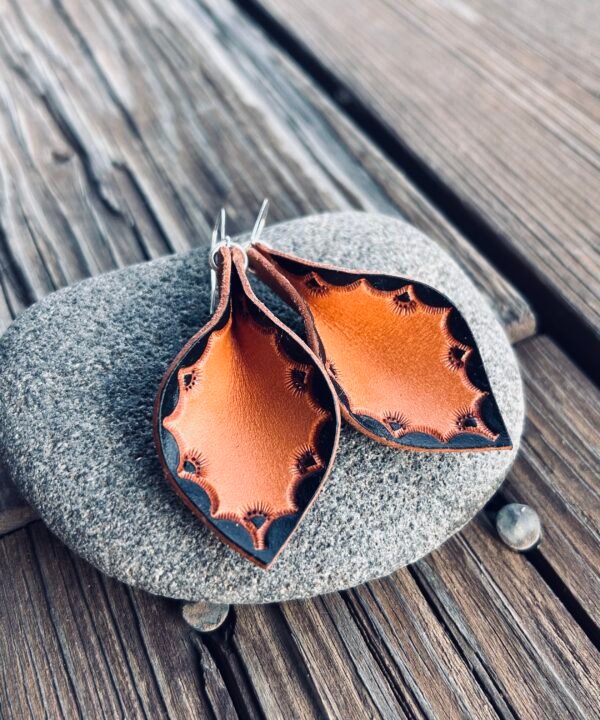 The Western Lace Earrings are slightly feminine, yet versatile. Because each pair is handmade, there may be some color variations. They have a soft, organic shape that complements the contours of most faces. These are available with a black or white border. All earrings are composed of full grain vegetable tanned leather.
